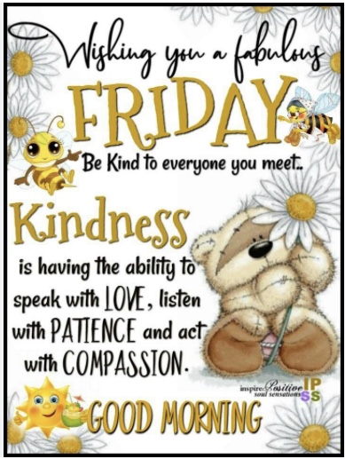 Fabulous FriYay and good morning fantastic souls. Today is our kindness challenge day. Let’s be kind, gentleness, encouraging and lift up others today … that includes yourself. Little acts of care truly make a difference. Remember, you are worthy, wanted and needed. May your day be filled in peace, ease, calm, care, kindness, comfort, grace, smiles, joy and hope. Here’s to a great a FriYay! 😊💕🙏🕊🍁